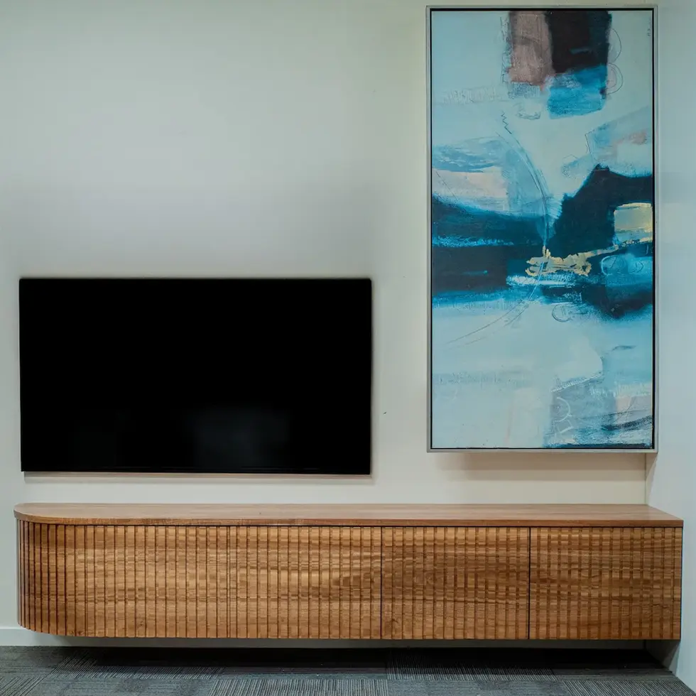 At 2040mm long, it features three soft-close cupboard doors and a rich natural grain that elevates the space without adding bulk. Shown here with a 55” TV, it floats effortlessly while anchoring the room with warmth and intention.